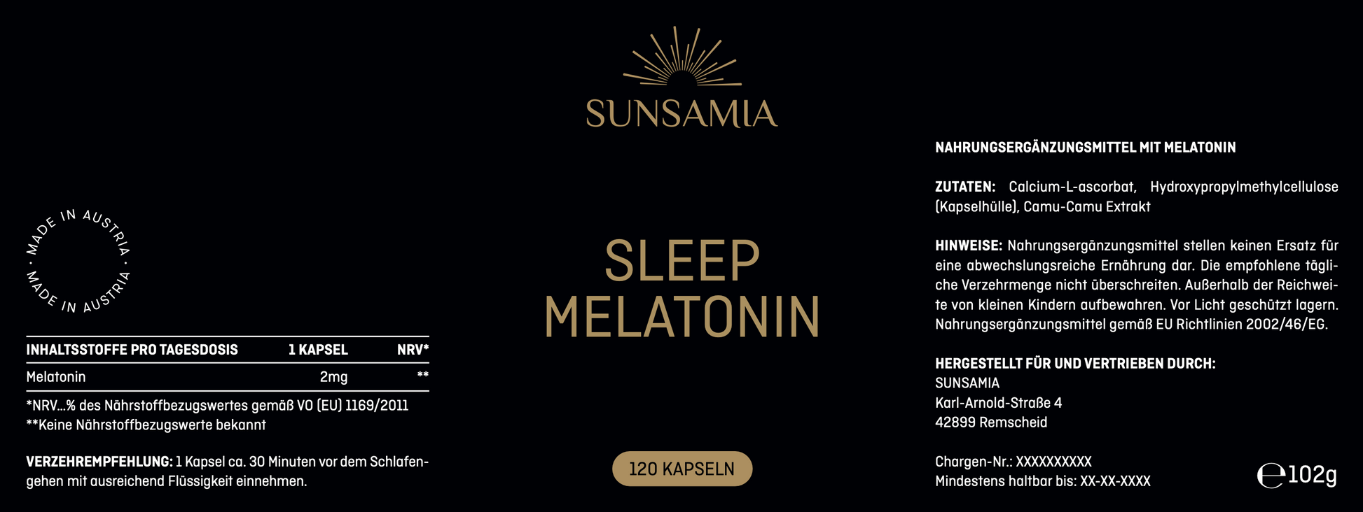 Calcium-L-ascorbat, Reismehl (Füllstoff), Melatonin, Hydroxypropylmethyl-Cellulose (Kapselhülle), Camu-Camu Extrakt